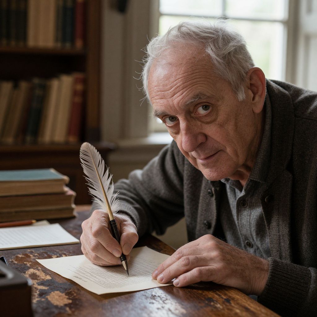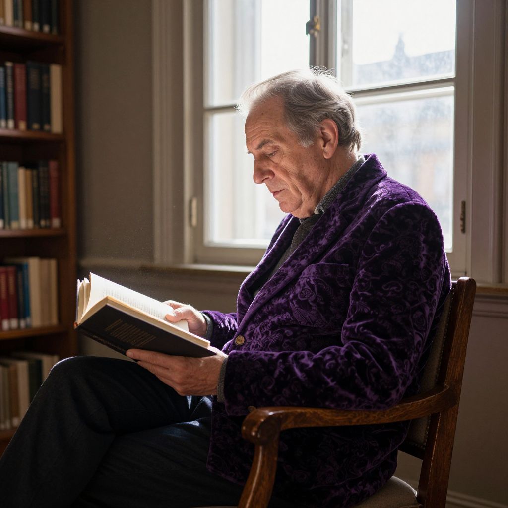 An older gentleman with a kind face, gray hair slightly brushed back, sits reading a book in a quiet library, wearing a luxurious purple velvet jacket with subtle patterns, the jacket resting on a wooden chair, the warm interior bathed in soft afternoon sunlight streaming through tall windows with book spines and dust motes in the air.