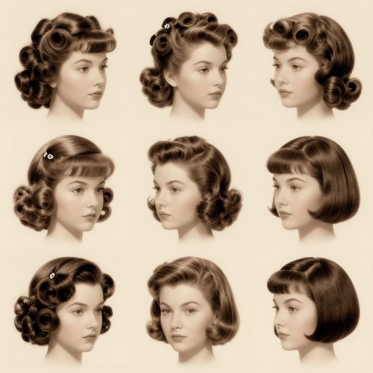 Hair styles reference illustrating classic vintage haircuts from the 1920s to 1960s, pin curls, victory rolls, and sleek bobs, portrayed with authentic textures and colors, in a sepia-toned retro setting.