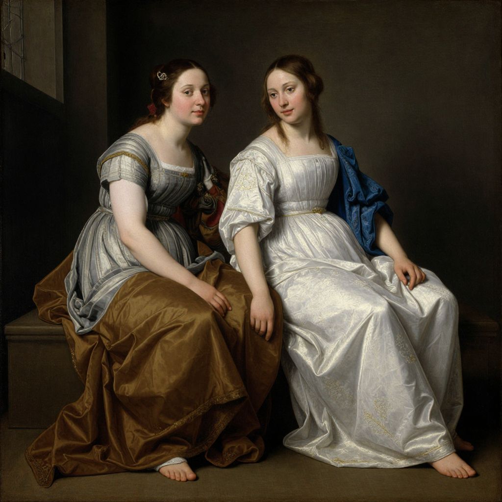 This is a photograph of a classical oil painting depicting two women seated side by side against a dark, plain background. The woman on the left has fair skin, dark brown hair, and wears a blue and white striped dress with puffed sleeves and a brown skirt. She has a slightly fuller figure. The woman on the right has fair skin, light brown hair, and wears a white, embroidered gown with puffed sleeves and a blue shawl draped over her shoulders. Both women have soft expressions and are barefoot. The lighting highlights their dresses, emphasizing the textures and details of the fabric. The overall style is reminiscent of 18th-century European portraiture.