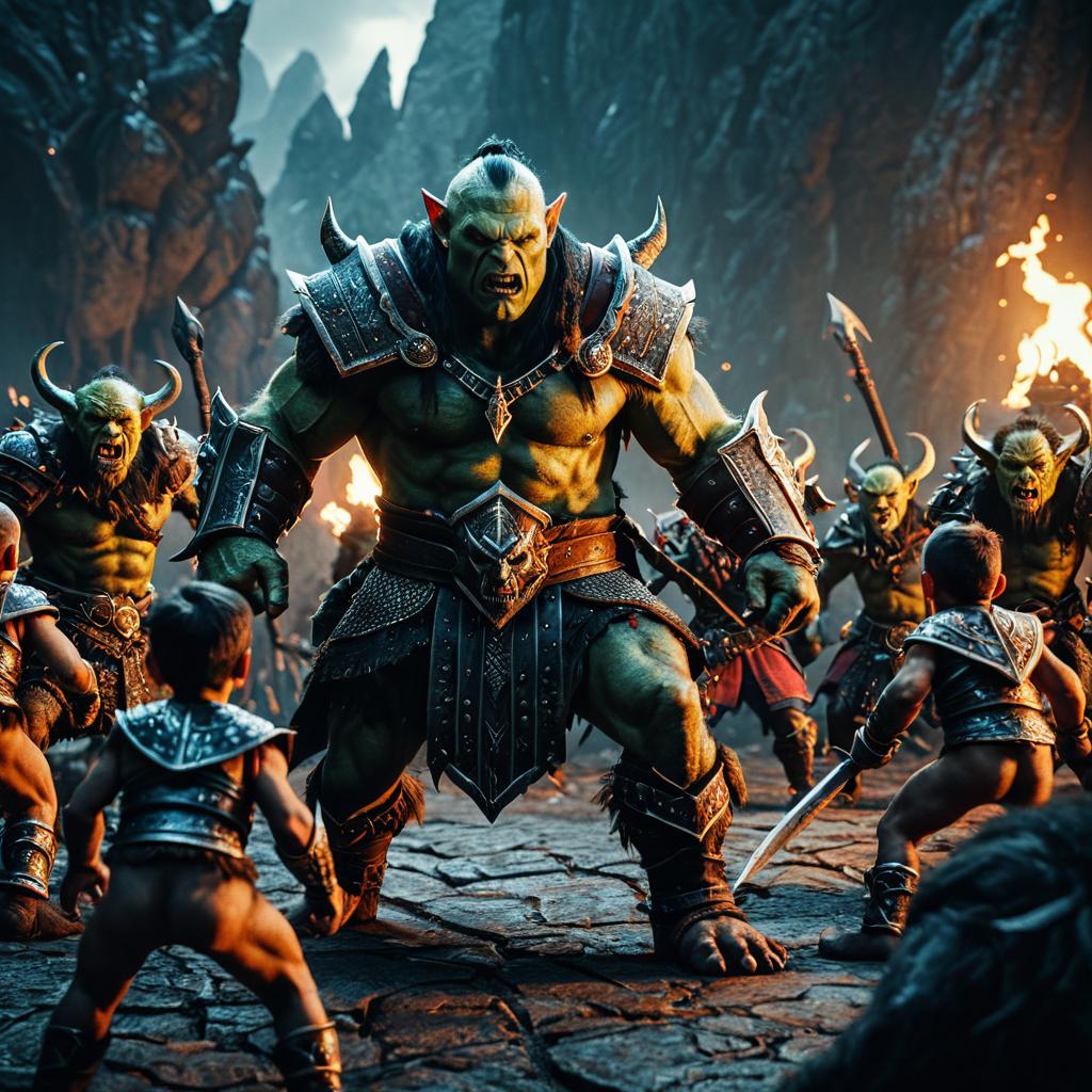 Warrior prince Varek Yon defending his children from a pack of angry orc demon imps, wide shot, intricate, hyper detailed, realistic, cinematic lighting, octane render, 8k