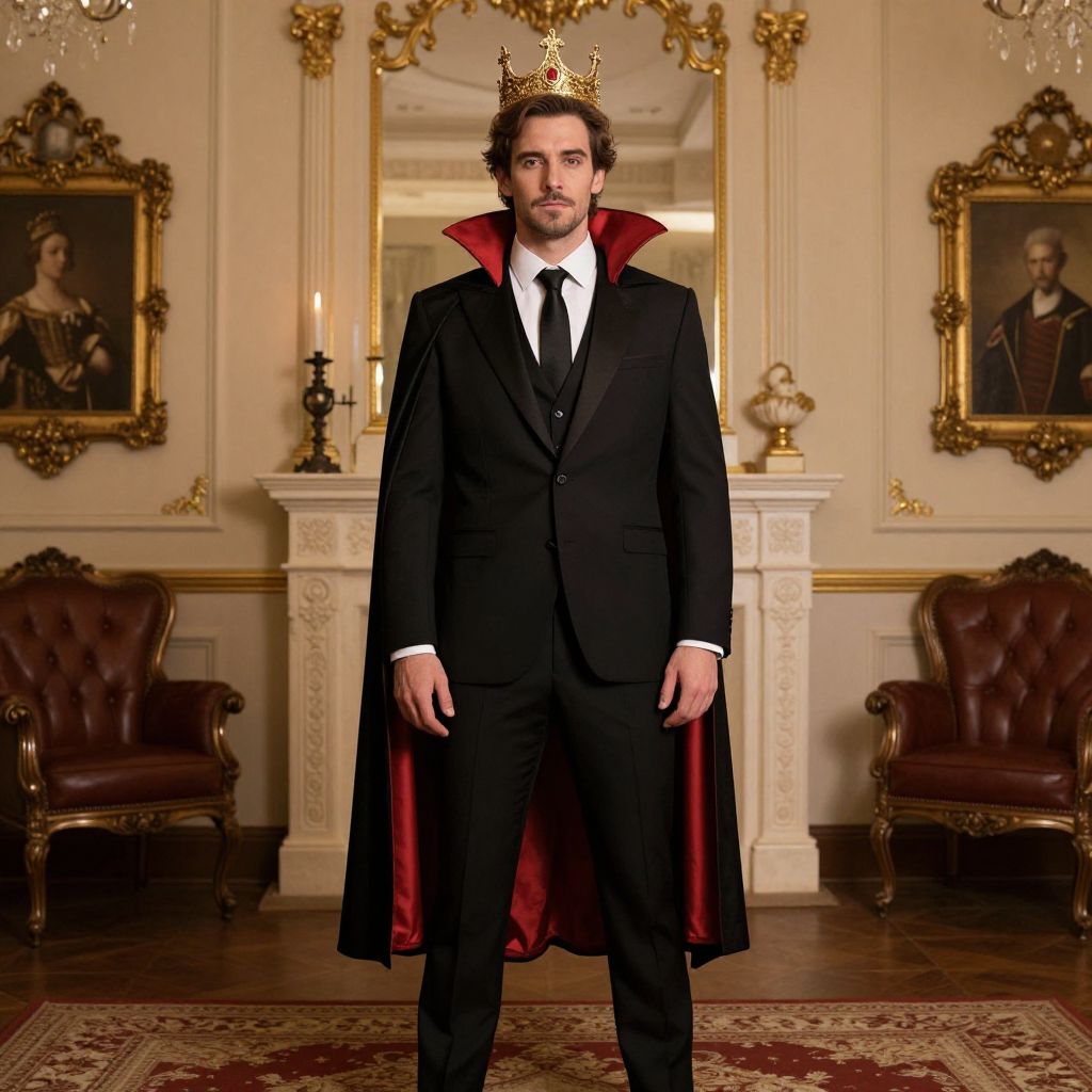 Photograph of a man standing in an opulent room. He wears a black suit with a red velvet cape, a white shirt, and a black tie. A gold crown rests on his curly brown hair. The background features ornate, cream-colored walls with gold trim, a large mirror, and two framed portraits. A white mantelpiece with a black candlestick is centered behind him. Two dark brown, leather armchairs are positioned on either side. The floor is wooden with a patterned red rug. The man has a serious expression, and the room is lit warmly, enhancing the luxurious atmosphere.