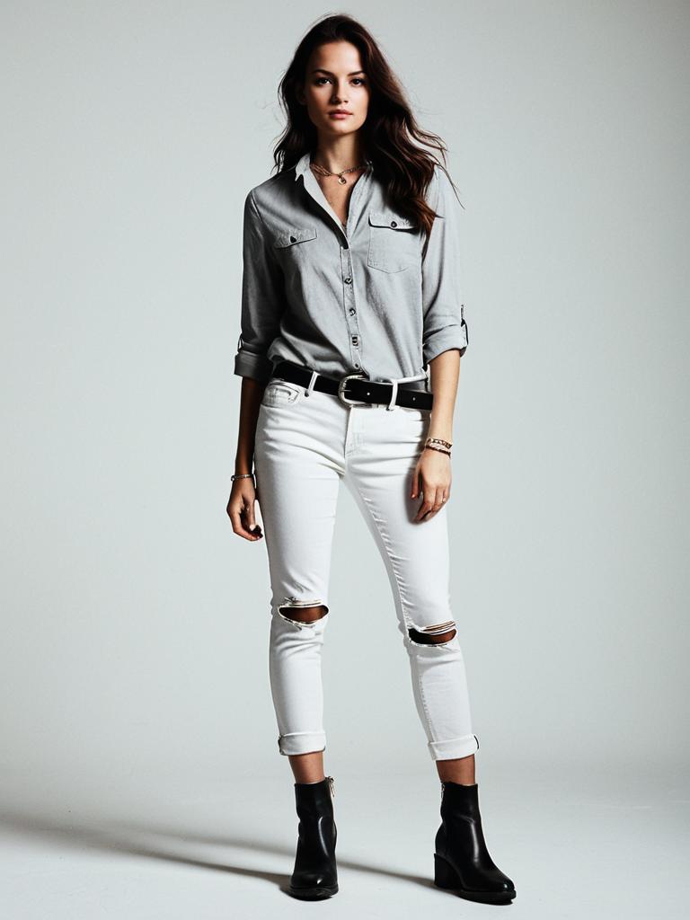 Woman, casual chic, light gray button-up shirt with rolled-up sleeves, white skinny jeans with knee cut-outs, black leather belt, silver buckle, black ankle boots, minimal jewelry with a thin necklace, plain white studio background. --sref 1399