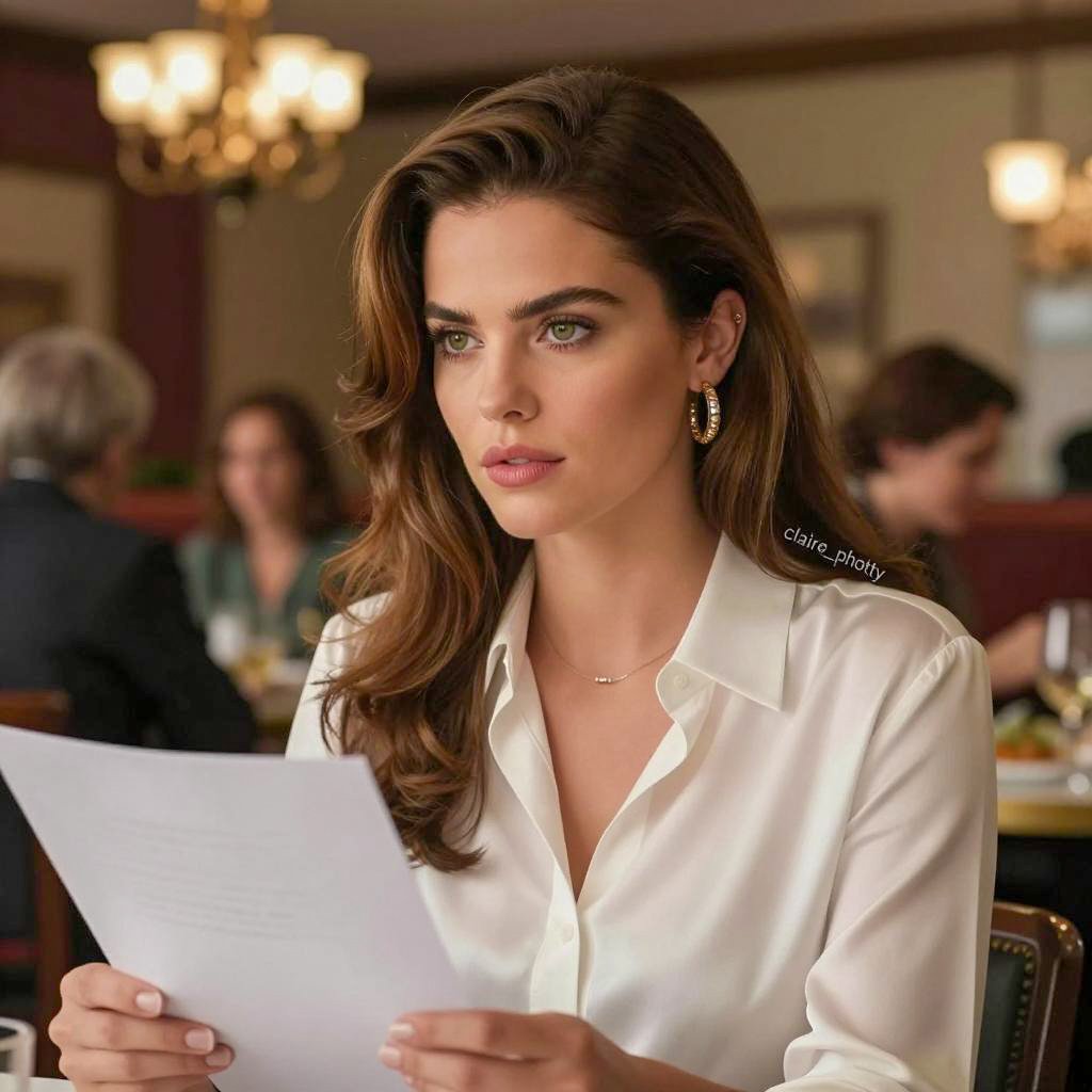 Portrait of a light-skinned woman with long, wavy brown hair and green eyes wearing a black and gray checkered blazer with a deep V-neck, revealing a white top underneath. She stands indoors against a blurred neutral background, wearing small pearl earrings and displaying a neutral expression with slightly parted lips.
