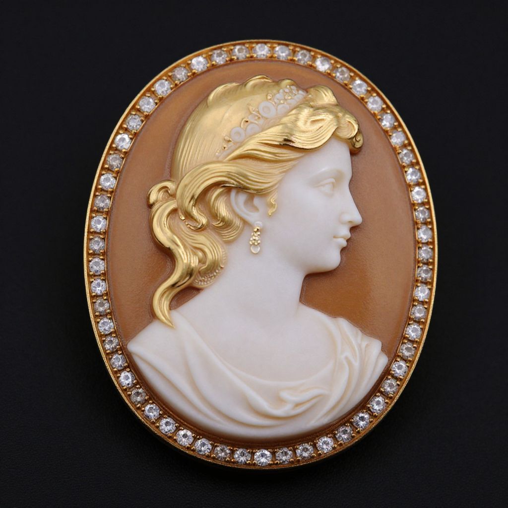 Elegant cameo brooch crafted in 14k gold, featuring a detailed profile portrait of a woman with flowing blonde hair, set against a warm brown background and accented with sparkling diamonds along its border.