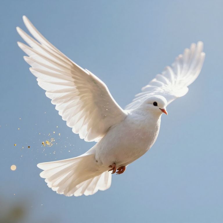 Photograph of a white dove with outstretched wings, flying against a clear blue sky, sunlight illuminating its feathers, tiny particles trailing behind.