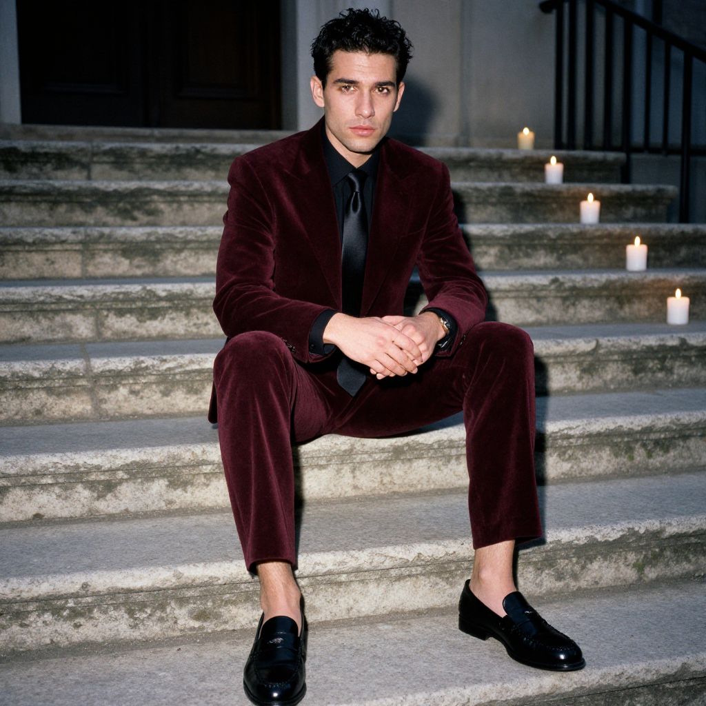 A man, deep burgundy tailored fit suit, luxurious velvet material, black dress shirt, satin black tie, sleek black leather loafers, weathered stone steps, flickering candles at dusk, kodachrome analog film, confident expression Man has masculine face and piercing eyes