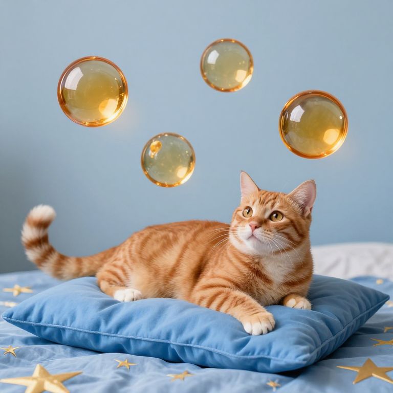 Lazily lounging on a soft blue pillow atop a bedspread adorned with golden star patterns, an orange tabby cat gazes curiously at four translucent amber bubbles suspended mid-air, each containing a glowing liquid that seems to defy gravity in this whimsical scene.