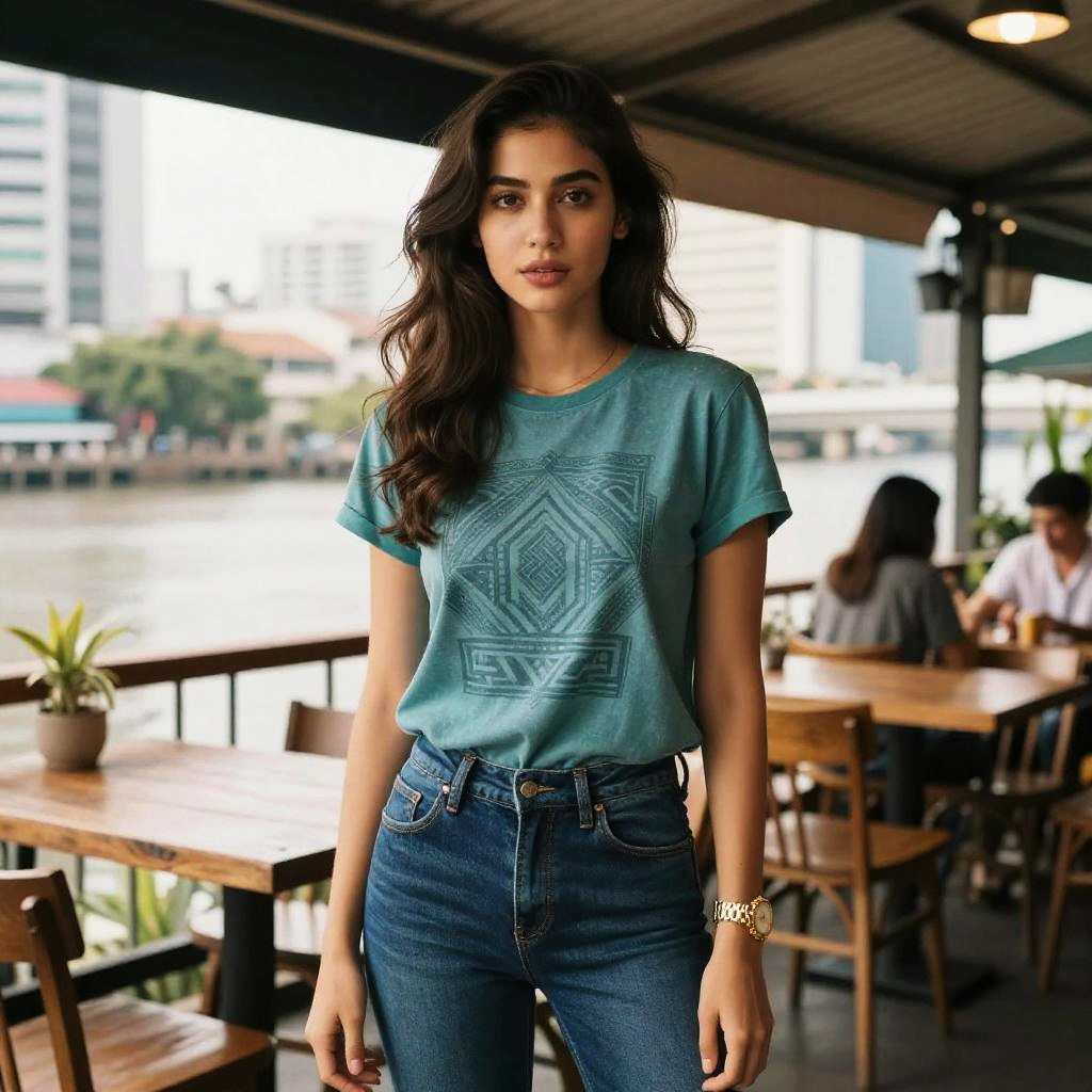 A slim woman in casual streetwear, wearing a faded teal T-shirt with a geometric tribal graphic and dark blue skinny jeans, accessorized with a golden metallic watch, loose wavy hair flowing, standing at a trendy restaurant in Bangkok with a river view, visual style: production ig. Sexy. Pretty face and beutiful eyes