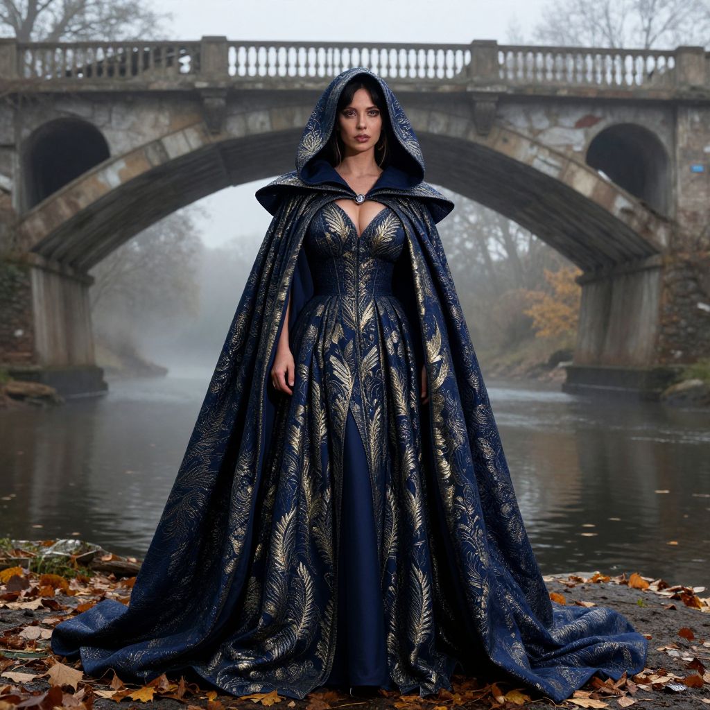 A lone woman with sharp features, full lips, and piercing hazel eyes stands beneath a crumbling bridge over a misty river, wearing an extravagant oversized hooded cloak in deep indigo and gold thread. The cloak drapes dramatically over her frame, creating a flowing, elegant silhouette that merges artistry and danger. The setting is moody and cinematic, with autumn leaves floating on the still water.. The woman has big tits and cute face