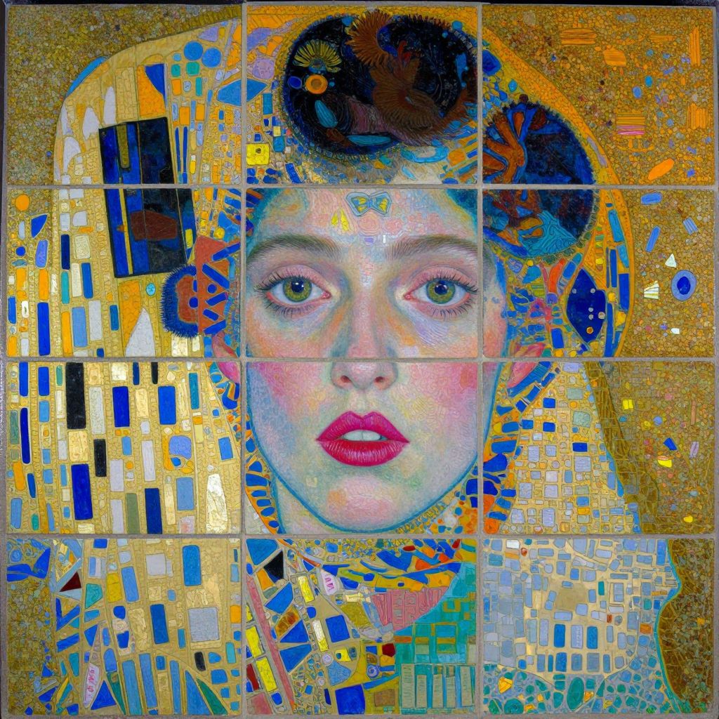 Vibrant portrait featuring Sergio Cerchi's signature style, where square panels of textured tiles in shades of blue, yellow, and orange frame a hyper-realistic close-up of a woman's face, blending extreme detail with dreamy, Klimt-inspired aesthetics.