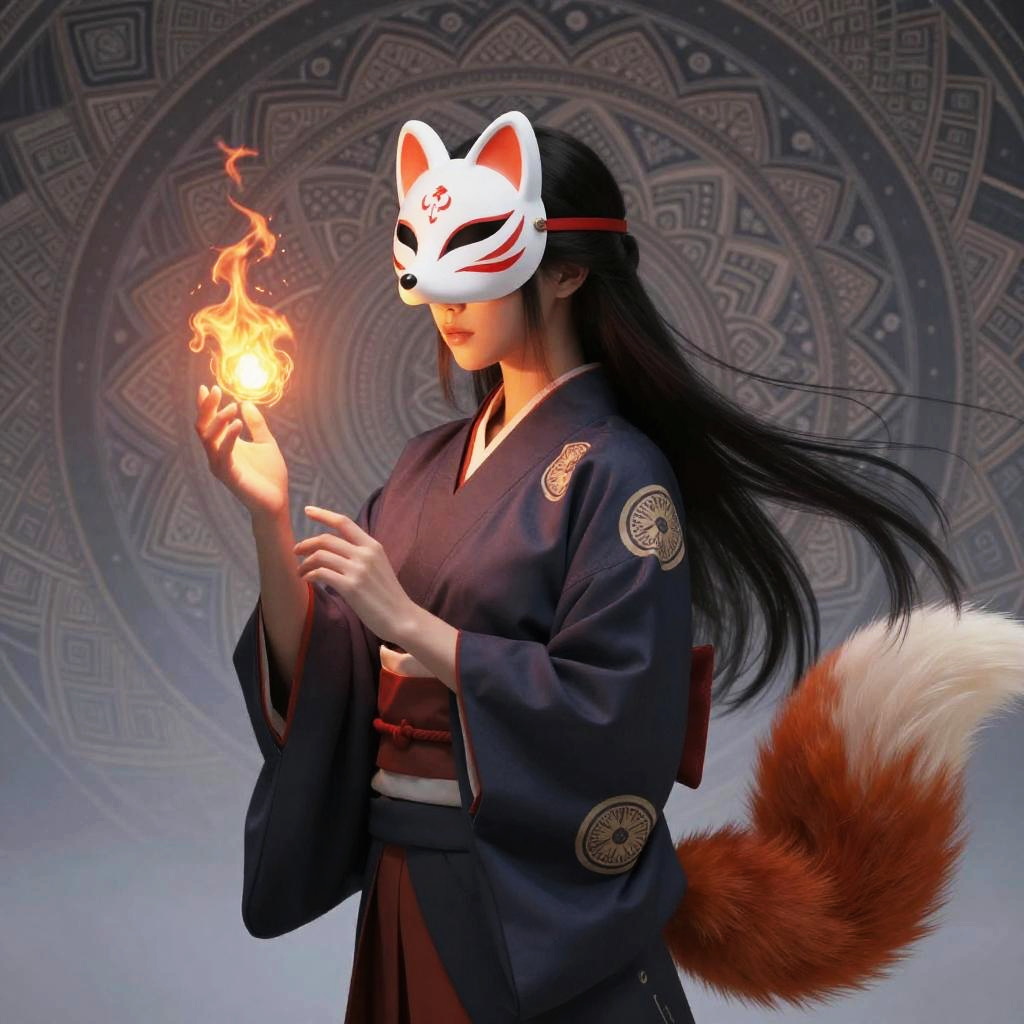 1girl, solo, official art, unity 8k wallpaper, ultra detailed, beautiful and aesthetic, masterpiece, best quality, photorealistic, Kitsune witch, fox mask, haori jacket, (foxfire spell), fox familiar, transformation, depth of field, Fantastical Atmosphere, Calming Palette, Tranquil Mood, Soft Shading (zentangle, mandala, tangle, entangle:0.7) abstract background, the most beautiful form of chaos, elegant