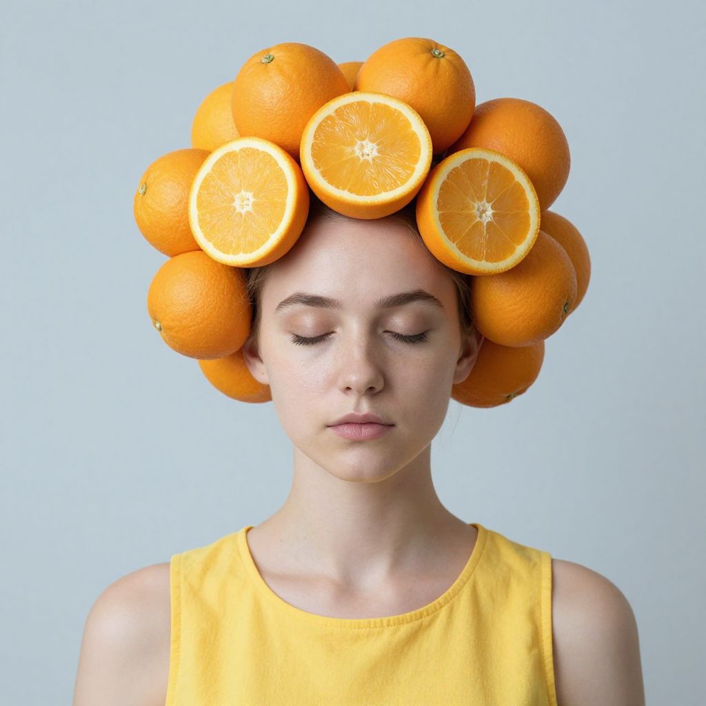 Photograph of a young woman with light skin and closed eyes, wearing a sleeveless yellow top. Her head and shoulders are adorned with a large arrangement of bright orange oranges and orange slices, creating a colorful, fruit-inspired headpiece. The background is a plain, light blue-gray, making the vibrant oranges stand out. Her expression is calm and serene.