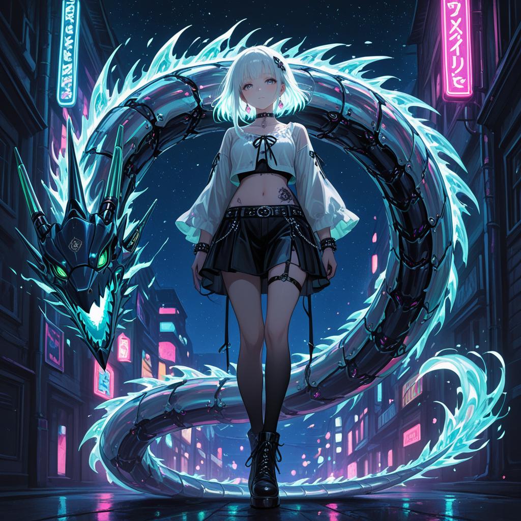 Cyberpunk Girl with Robotic Dragon at Night in Harajuku