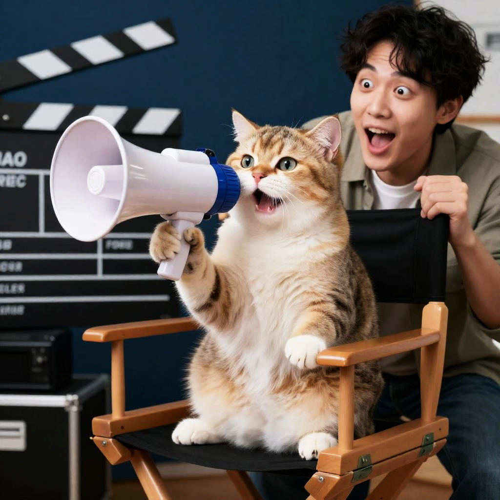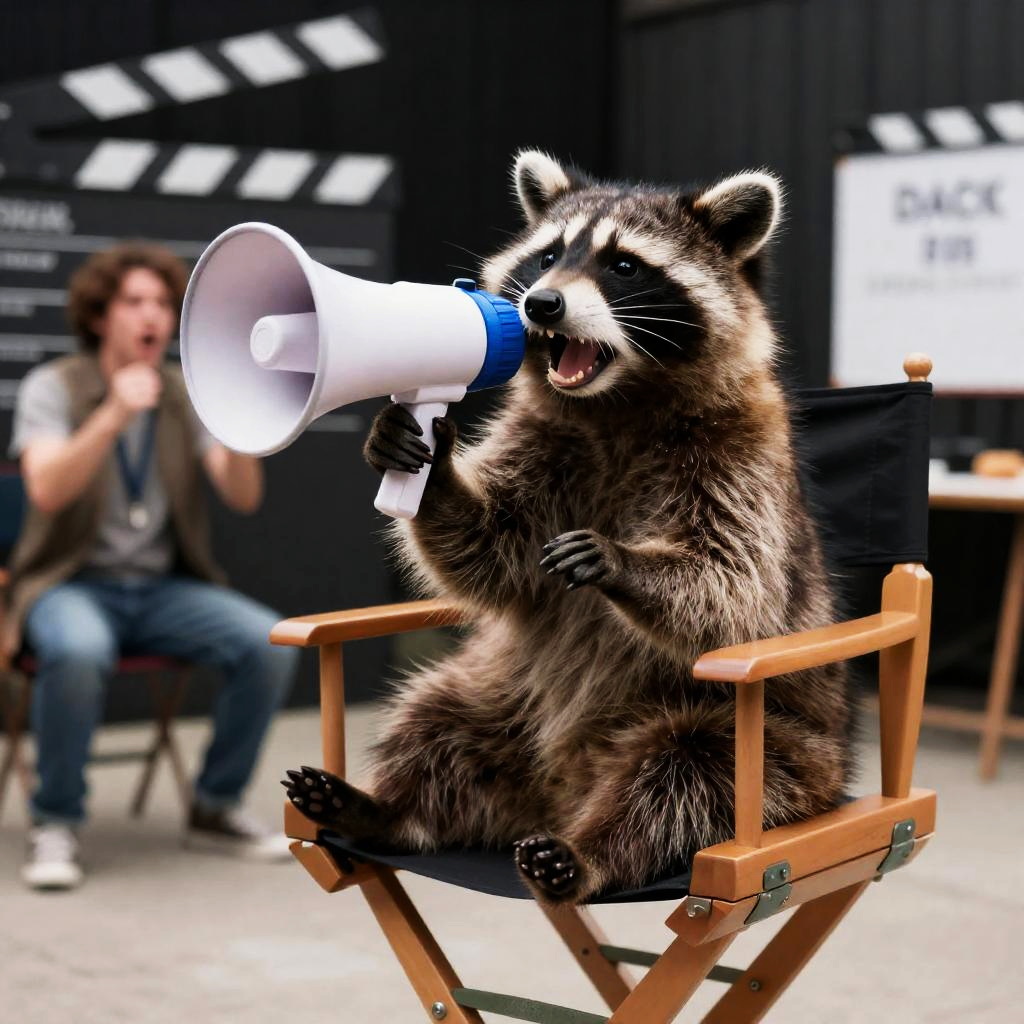 Playful image of a owl sitting in a director's chair, holding a megaphone, with a rabbit acting out a scene on a movie set, bright, amusing expressions, high resolution, entertaining
