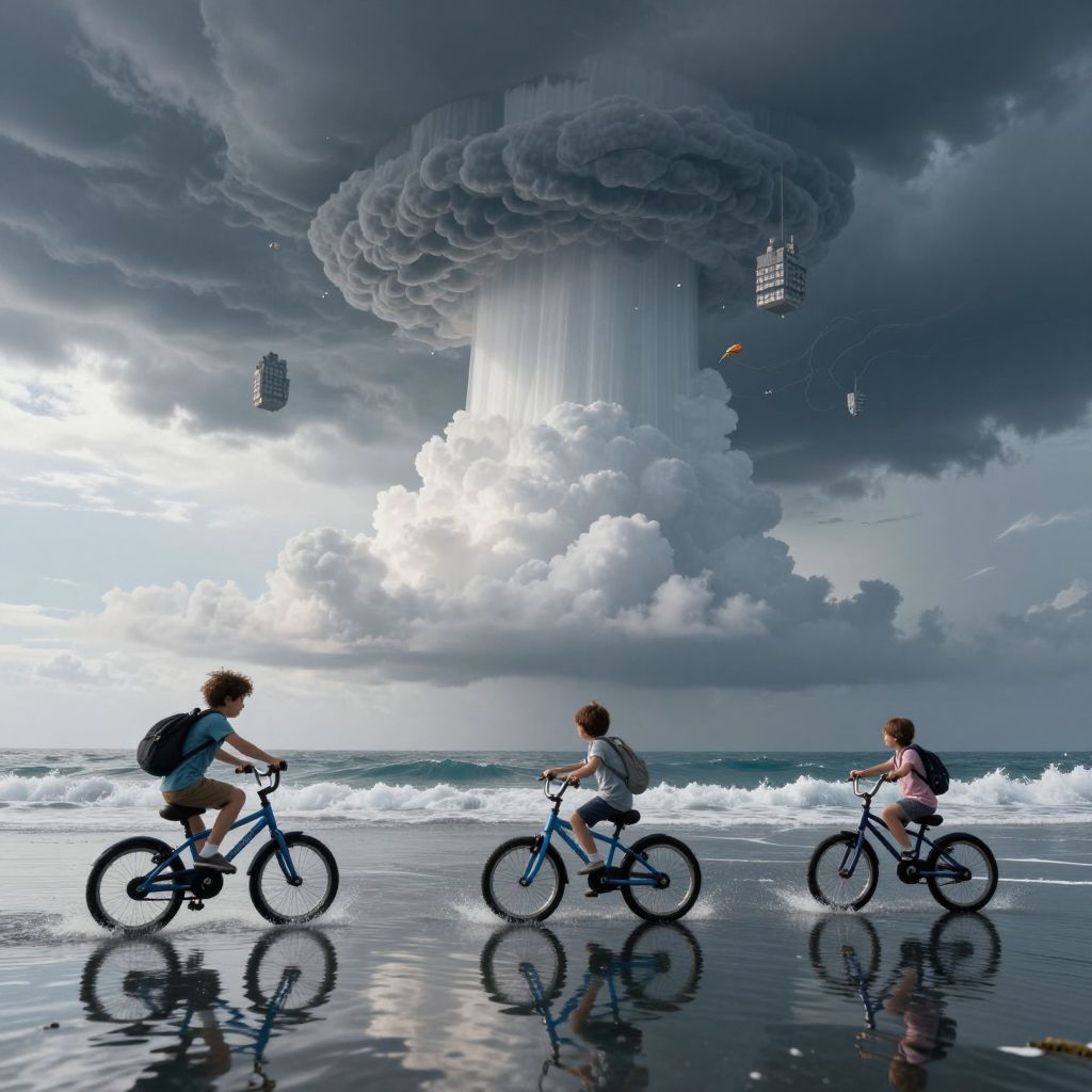 Person riding a bicycle across a calm, reflective ocean surface, facing a surreal tornado-like cloud formation descending from the sky, with fluffy cumulus clouds framing the horizon.