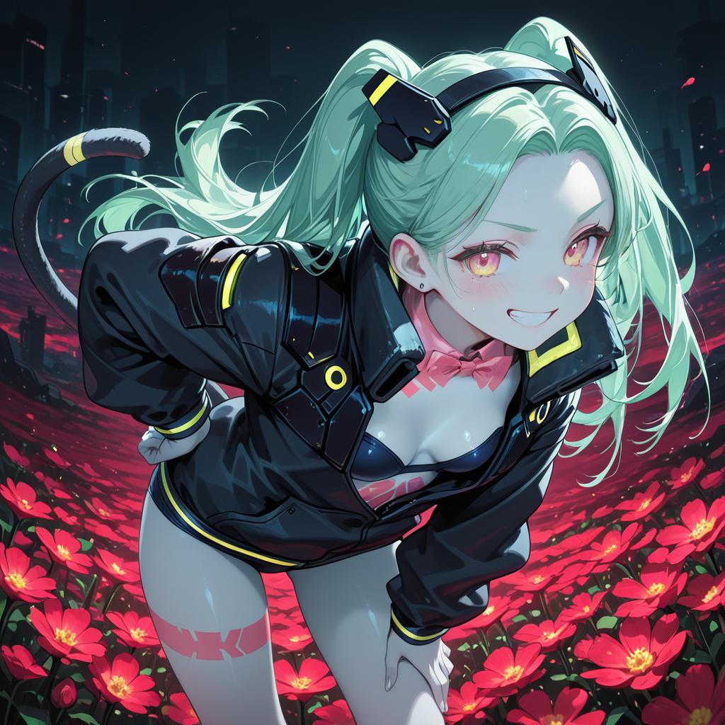 Masterpiece, best quality, highres, 1girl, rebecca \(cyberpunk\), solo, twin tail, hairband, mechanical eye, colored sclera, red sclera, colored skin, white skin, leg tattoo, neck tattoo, green hair, long hair, small breasts, underwear, fang, red pupils, skin fang, red eyes, black jacket, hand on hip, flower field, leaning forward, evil grin