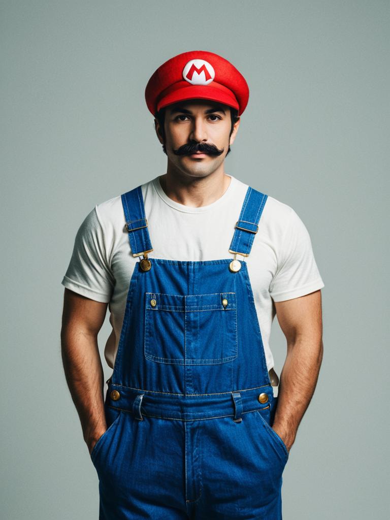 Mario bros costume man fancy, 1boy, solo, male focus, overalls, hat, realistic, blue overalls, facial hair, simple background, mustache, upper body