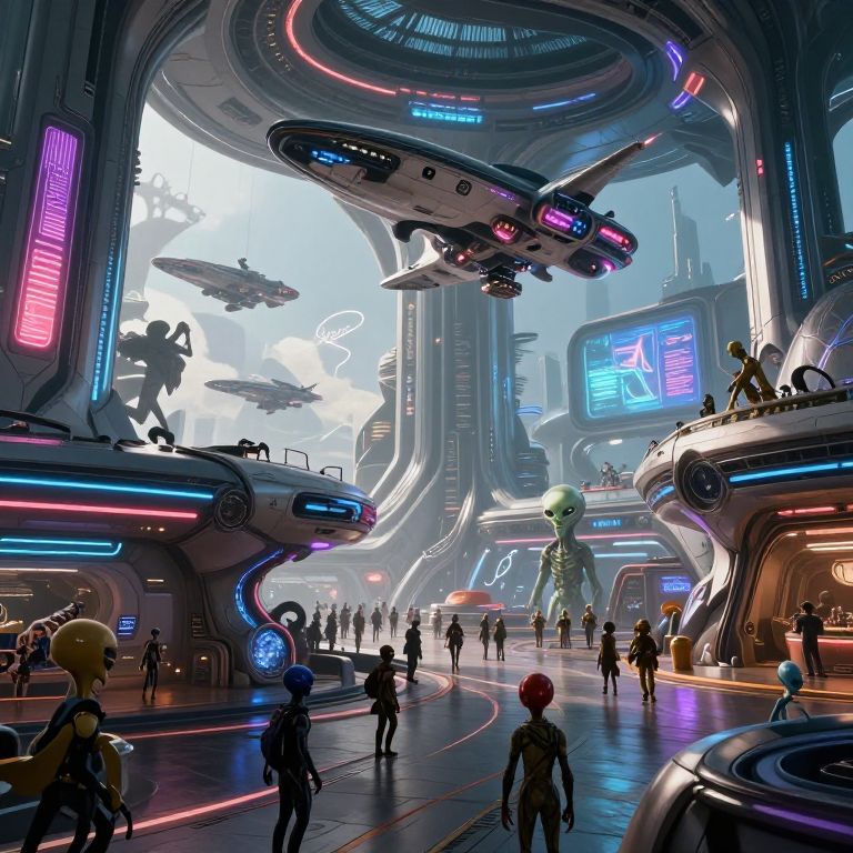 Triten futuristic spaceport bustling with diverse alien species and advanced spacecrafts taking off, neon signage and holographic ads illuminating the scene, sleek metallic architecture combined with organic shapes, energetic sci-fi metropolis vibe