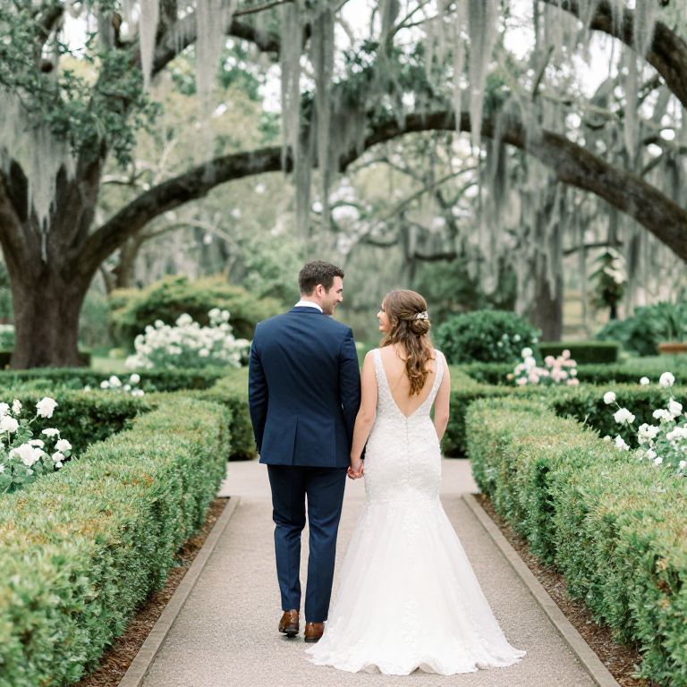 Photograph of a bride and groom walking down a paved path in a lush, green garden. The groom, in a dark blue suit with a white shirt, has short dark hair. The bride, with long brown hair in a loose updo, wears a white, strapless, lace wedding dress. They hold hands, walking away from the camera. The path is flanked by manicured hedges and white flowers. Overhead, large trees with hanging Spanish moss create a serene, romantic atmosphere. The image has a bright, slightly overexposed feel, emphasizing the greenery and white flowers.