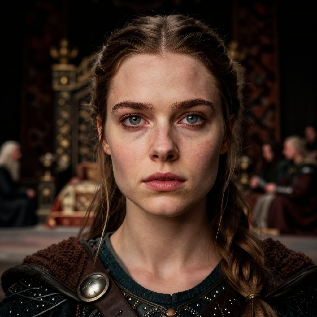 Photograph of a fair-skinned young woman with blue eyes, braided brown hair, serious expression, wearing a dark, textured cloak, against a