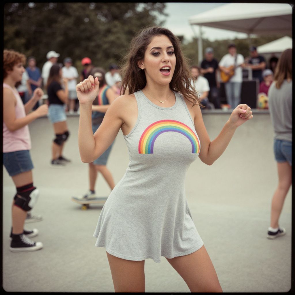 Photograph of a smiling, brunette woman with medium build, wearing a white tank dress with a rainbow graphic, dancing energetically at an outdoor skate