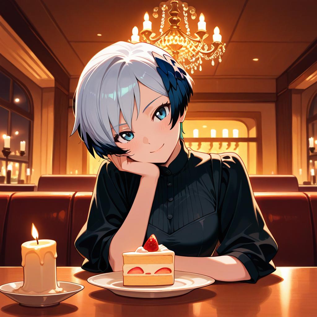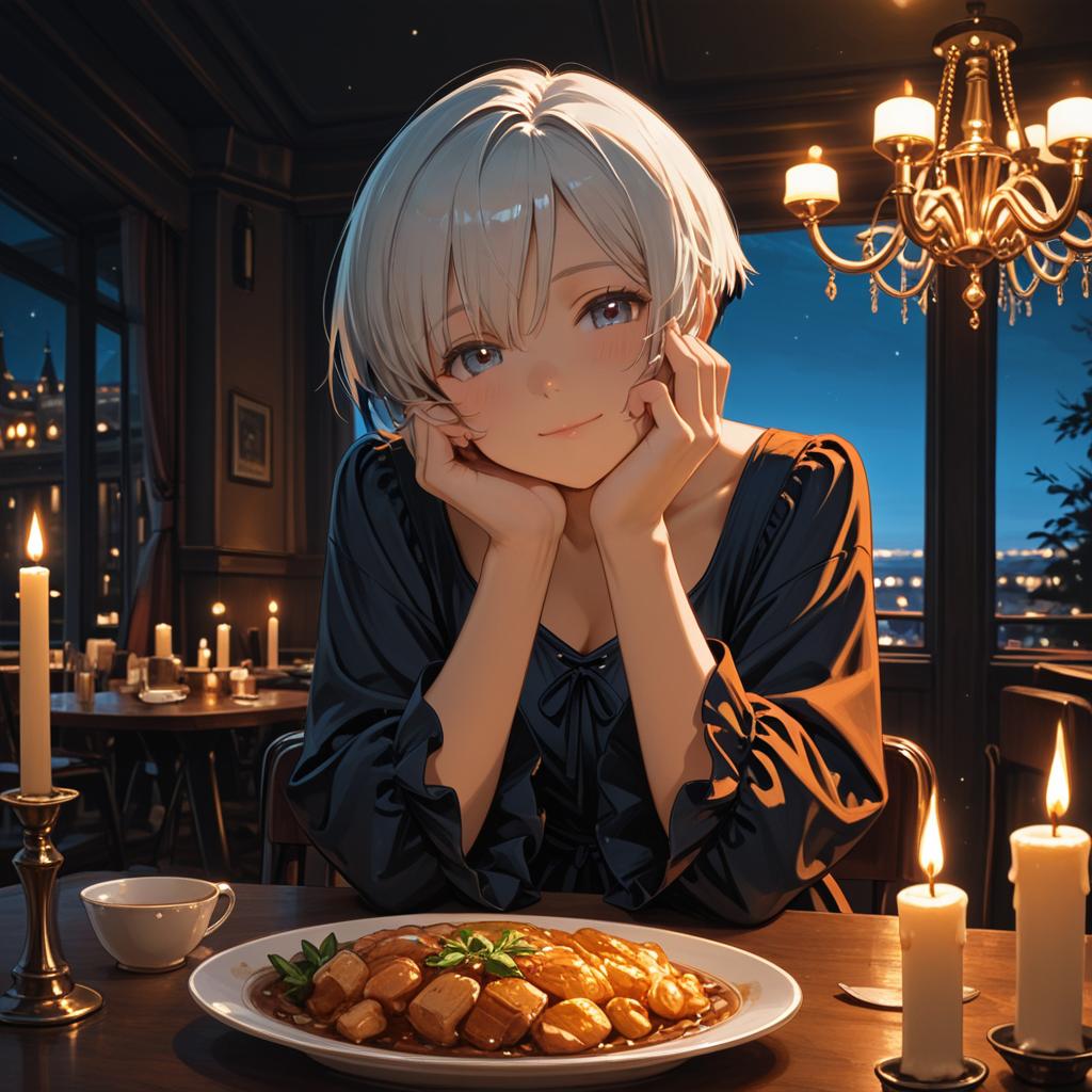 Masterpiece, best quality, Gwendolyn_Tennyson, 1girl, solo, dress, sitting, restaurant, fancy restaurant, candle, chandelier, (nighttime :1.2), ( warm lighting :1), hand on own face, smile, tired, head tilt, looking at viewer