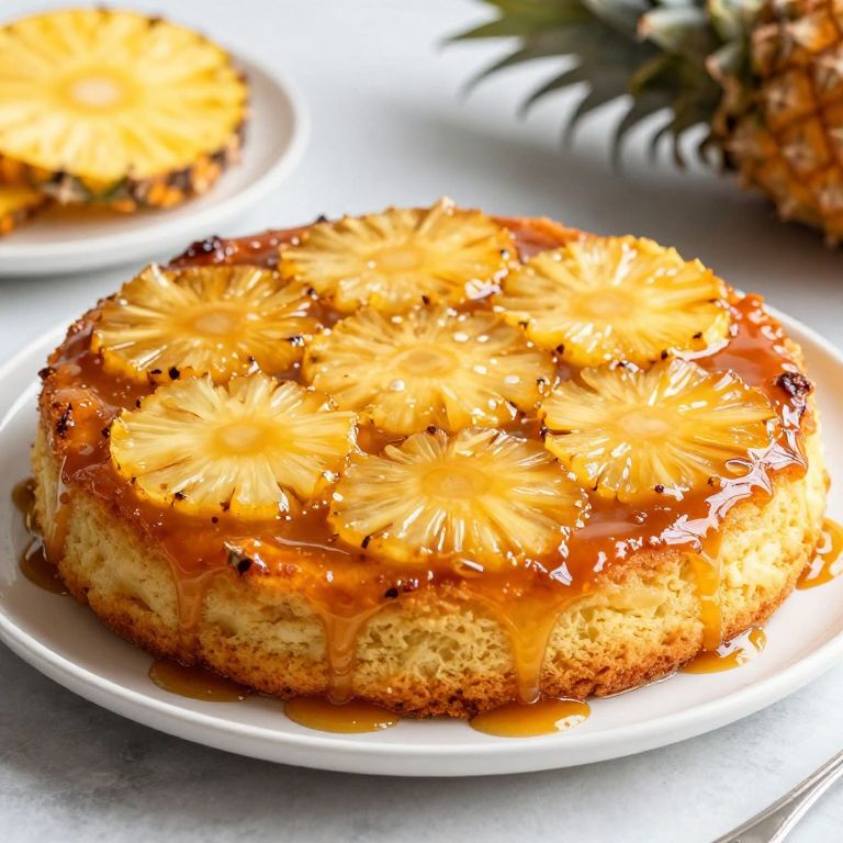 Photograph of a golden-brown, pineapple-topped, glossy caramel cake on a white plate, with a blurred pineapple in the background.