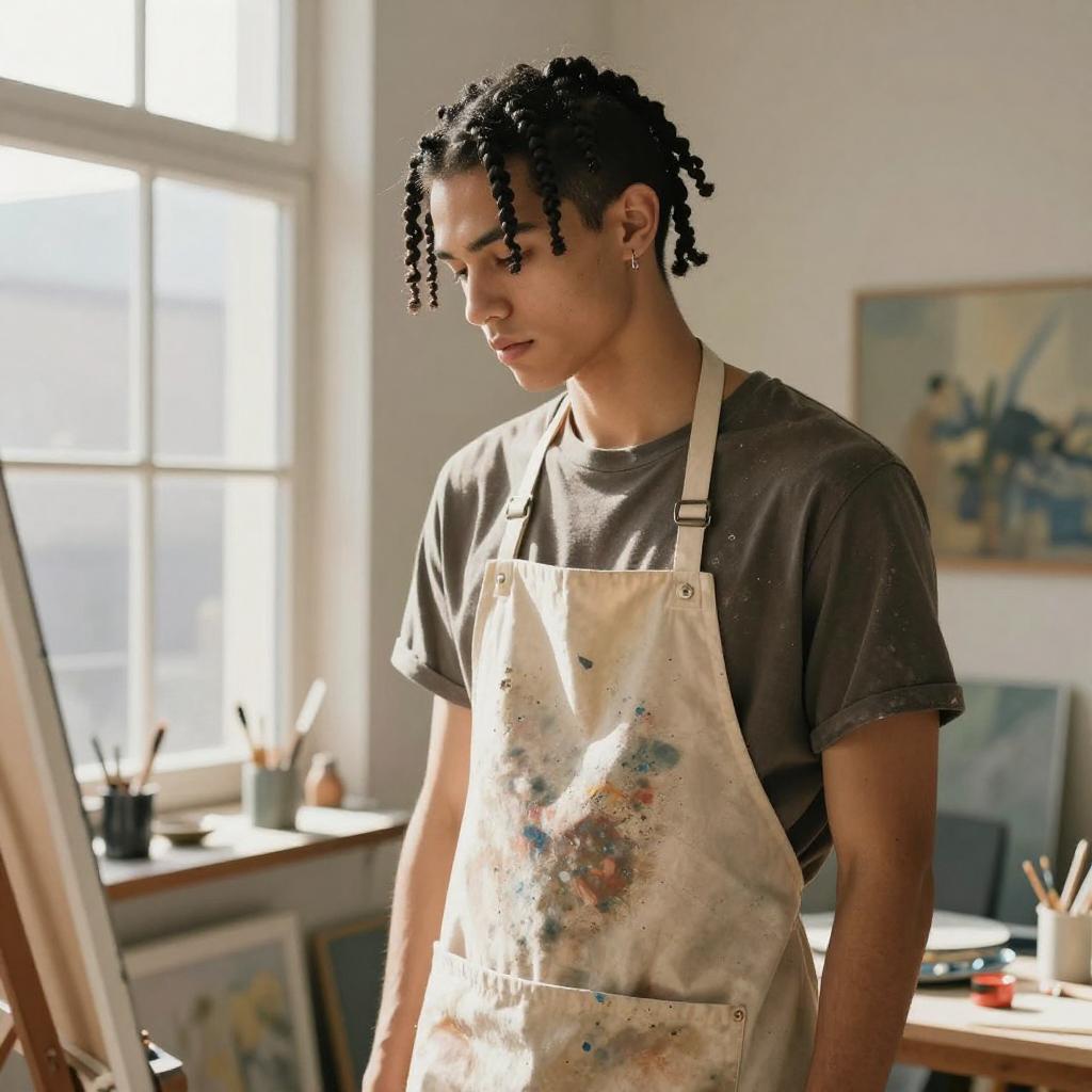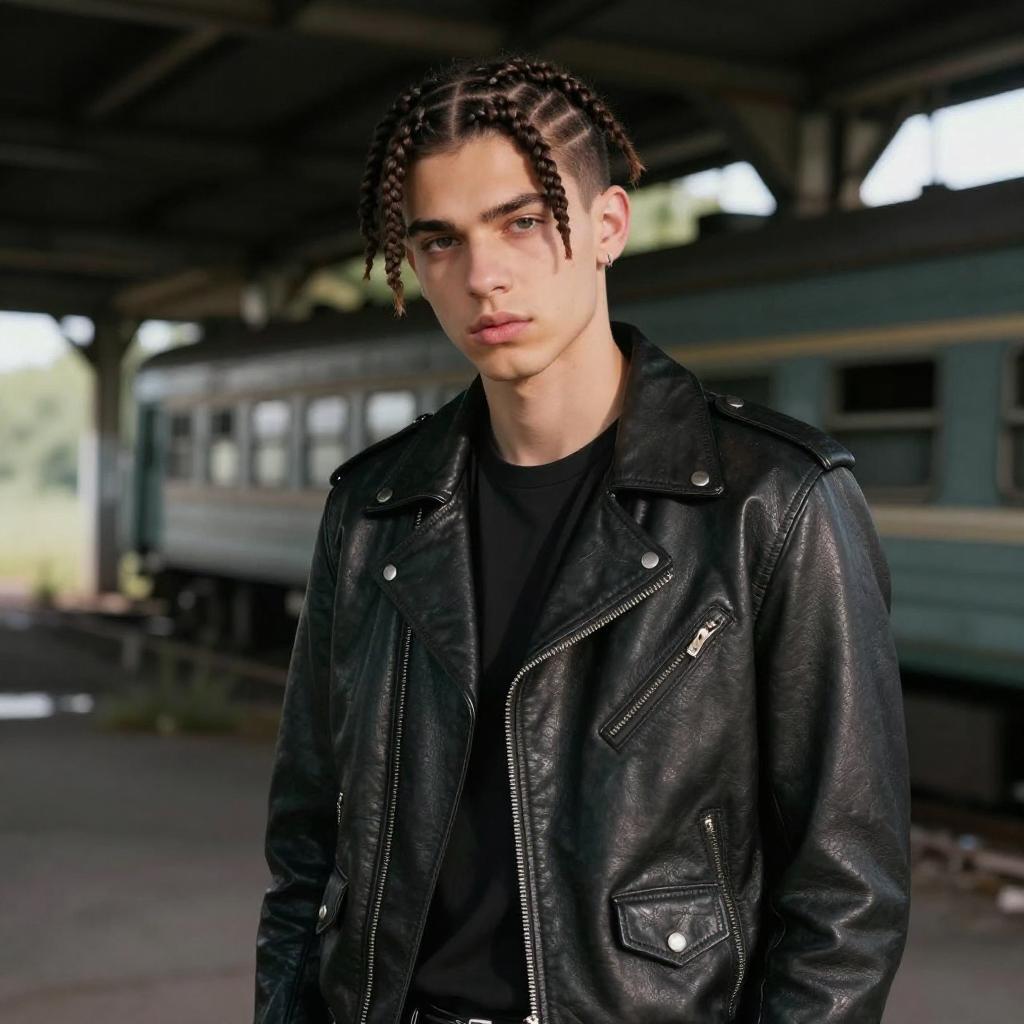 High Top Twists hairstyle on man, wearing casual hoodie and jeans, in graffiti-covered skate park, captured in fashion editorial style with soft overcast light.