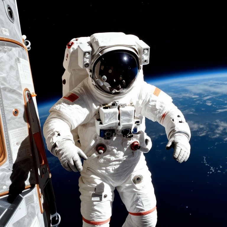 Astronaut on a spacewalk outside the spaceship, with the stars and Earth visible in the background