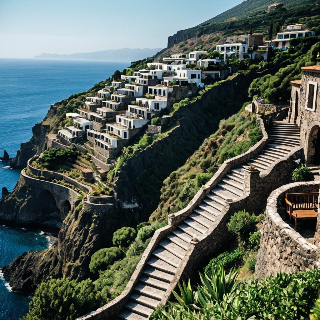 Historic coastal amphitheater, picturesque Mediterranean setting, ancient marble columns and open sky, rustic wooden furniture, lush greenery, ocean view, high resolution, ultra-detailed
