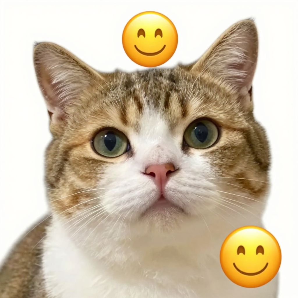 Create emoji from photo of a playful cat with tilted head, bright eyes and subtle grin, simplified fur textures, high contrast colors, rounded shapes, cute and approachable style, optimized for instant reaction icons