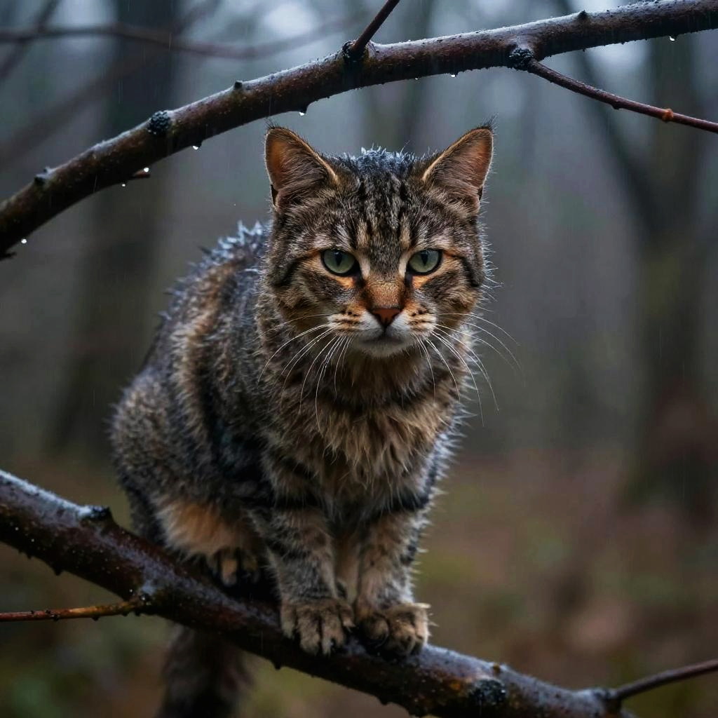 Photograph of a wet, alert tabby cat with striking green eyes, perched on a rain-droplet-covered branch in a blurred forest background