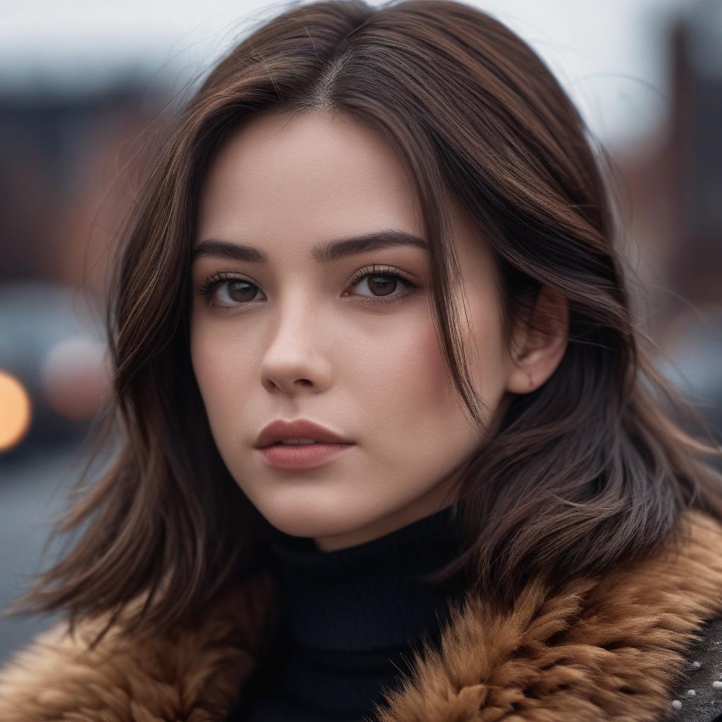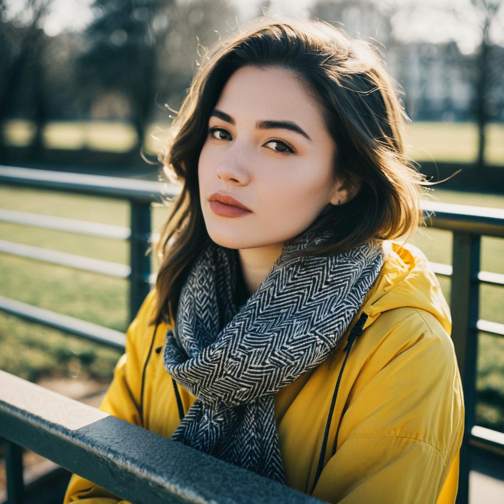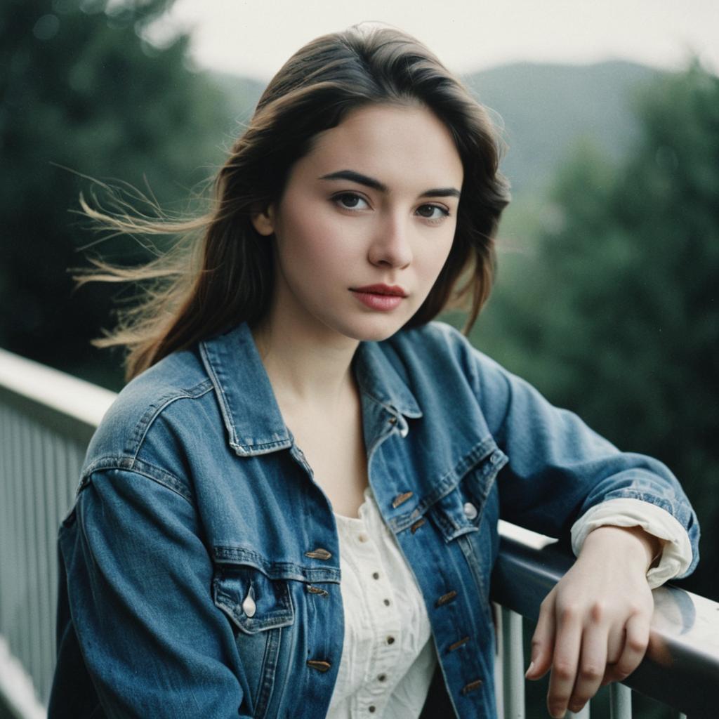 A soft portrait of a young woman leaning on a railing outdoors, natural light illuminating her face, gentle focus on her eyes and expression, wearing a cozy beige sweater and a brown beret, red lipstick accentuating her lips, subtle texture in clothing, blurred muted background with cool tones, peaceful and contemplative mood