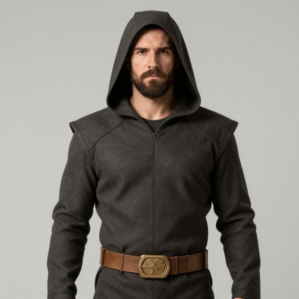 Old superhero costume, 1boy, male focus, solo, facial hair, belt, hood, beard, standing, mustache
