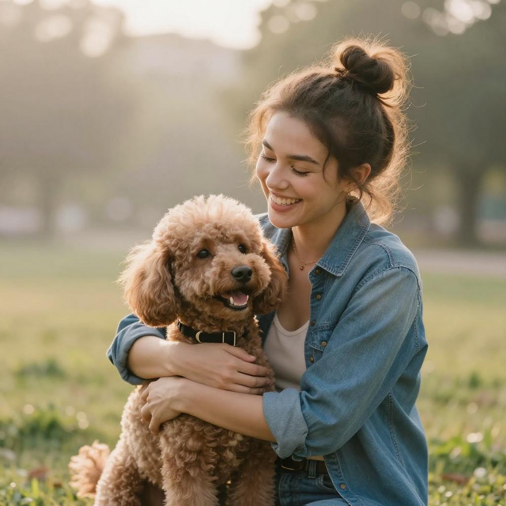 Young woman in a park, lifestyle stock photography style, happily hugging her dog, both smiling and laughing, olive-skinned woman with messy bun and denim shirt over a tank top, with a poodle dog, in early-morning park with misty air and soft golden sunrise light, warm natural light, soft bokeh background, vibrant colors, high resolution, ultra-detailed