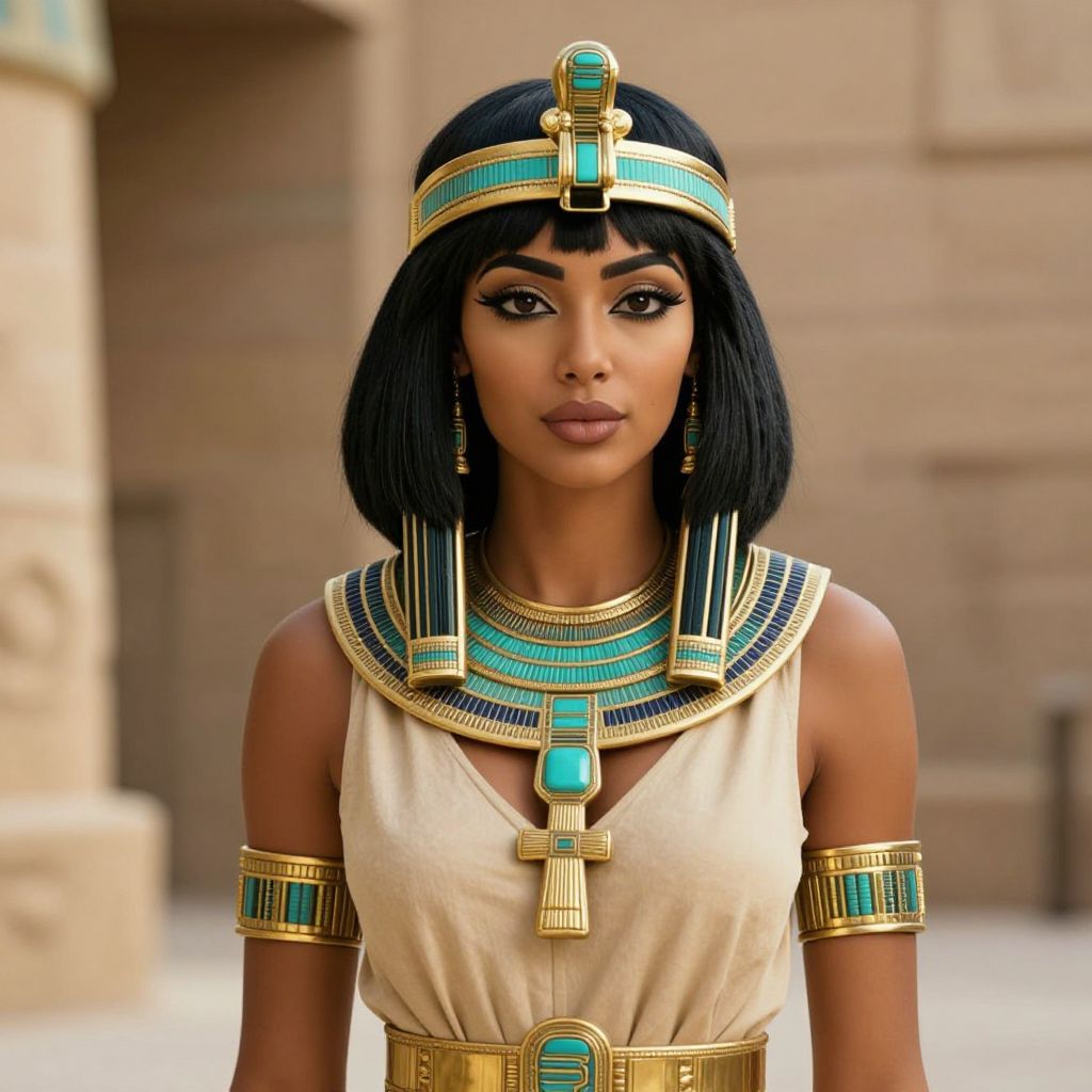 This is a digitally rendered image of a woman with dark skin and sleek, black bob haircut, styled with straight bangs. She is dressed in an ancient Egyptian-inspired outfit featuring a cream-colored, sleeveless top with a deep V-neck. She wears a gold and turquoise striped headpiece, matching necklace, and arm bands, along with a gold waist belt. Her makeup includes dark, defined eyebrows and full lips. The background is blurred, depicting a beige stone building, suggesting an outdoor setting reminiscent of ancient Egyptian architecture. The image has a realistic, CGI style with vibrant, detailed colors and textures.