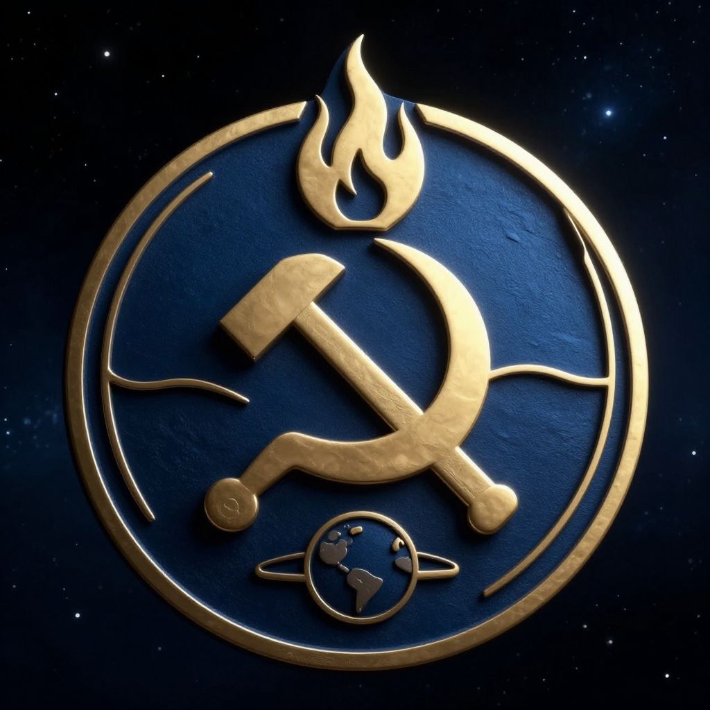 A digital, 3D-rendered emblem features a gold hammer and sickle crossed at the handles, with a flame atop the hammerhead. The emblem is set against a deep blue circular background with a textured surface, bordered by a thin gold ring. Below the crossed tools, a small globe with a pin through it is depicted. The background is a dark, starry space, adding a cosmic feel to the image. The overall design is bold and symbolic, reminiscent of communist or revolutionary iconography.
