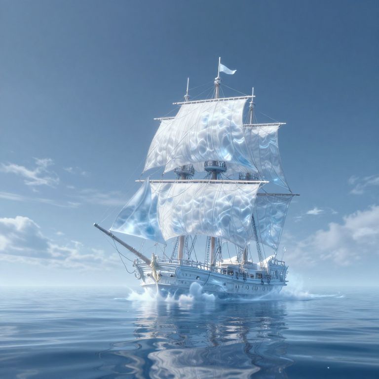 Sails of ethereal ice ripple and shimmer as they catch invisible winds, propelling ghostly ships across a mirrored sea where the boundary between water and sky dissolves into a dreamlike realm.