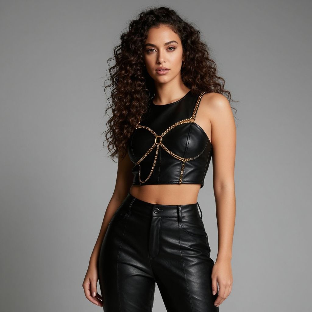 Portrait of a glamorous woman with medium skin tone and short dark hair wearing a sleeveless beige blouse featuring an embellished collar, paired with a shiny gold pleated mini skirt. She accessorizes with large gold hoop earrings. The background is plain beige, emphasizing her elegant and stylish outfit.