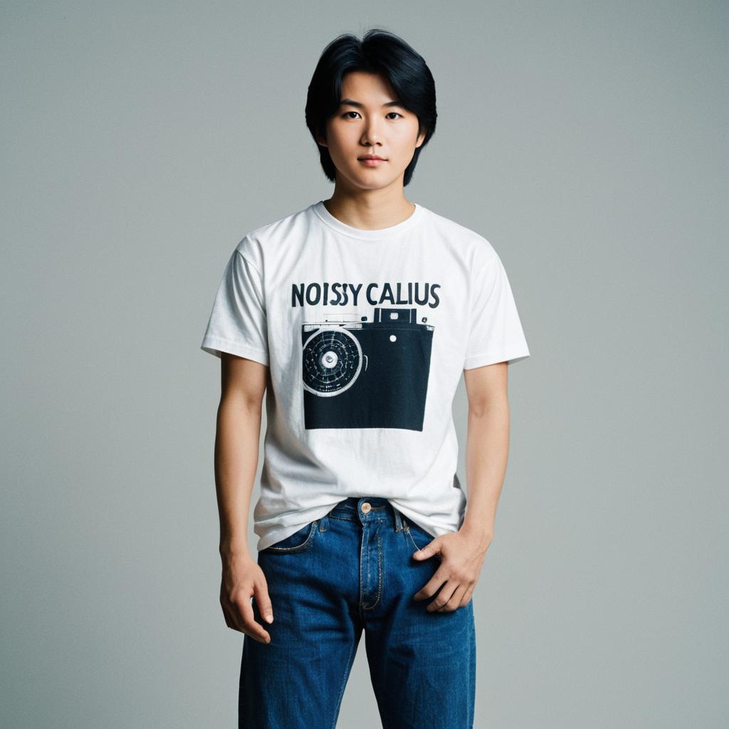Portrait of an Asian young man standing against a plain grey background, wearing a white t-shirt with a black graphic of a camera and text, paired with blue denim jeans. The man has medium-length black hair and is looking directly at the camera with a neutral expression, hands relaxed at his sides.