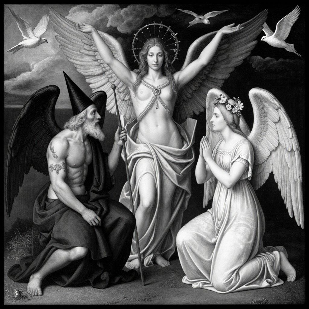 The image presents a striking and intricate scene reminiscent of the works of Hieronymus Bosch and Pieter Bruegel the elder, with a touch of Ernst Haeckel's biological illustrations. At the center, a figure with outstretched wings stands prominently, flanked by two other winged figures on either side. To the left, an elderly man with a long beard and a pointed hat sits, while to the right, a woman in a flowing dress with a floral headpiece kneels. In the foreground, a muscular figure with a staff stands between the two winged figures, his body adorned with tattoos. The background is dark, with clouds and birds adding to the mystical atmosphere. The overall composition is balanced, with the figures arranged in a triangular formation, creating a sense of depth and perspective. The use of black and white enhances the dramatic effect, highlighting the textures and details of the figures and their surroundings.