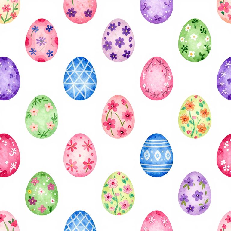 Watercolor-style pattern of colorful Easter eggs with floral and geometric designs, scattered uniformly on a white background.