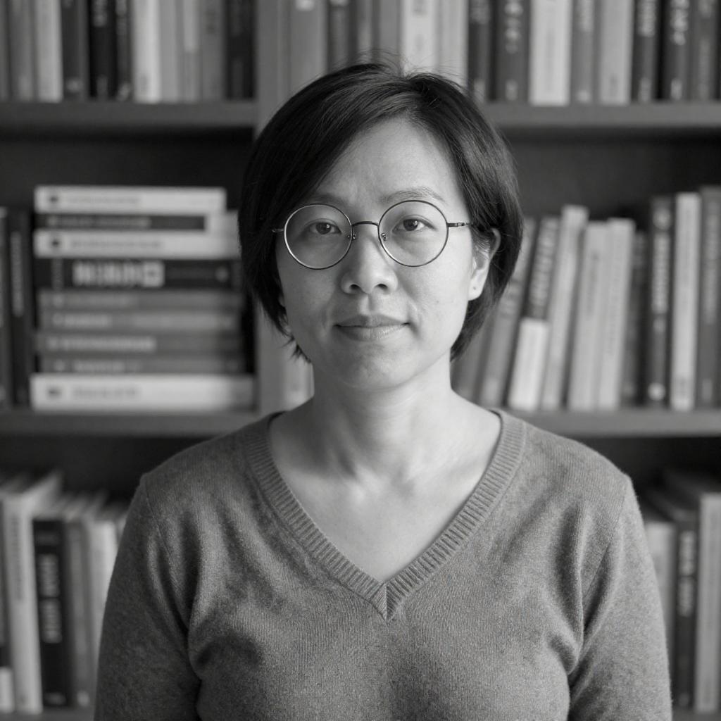 Close-up photograph of an elderly woman with short, wavy brown hair, light skin, and pink lipstick. She wears a white, patterned sleeveless top and a bead necklace. Background includes a blurred bookshelf. She has a gentle smile and direct gaze.