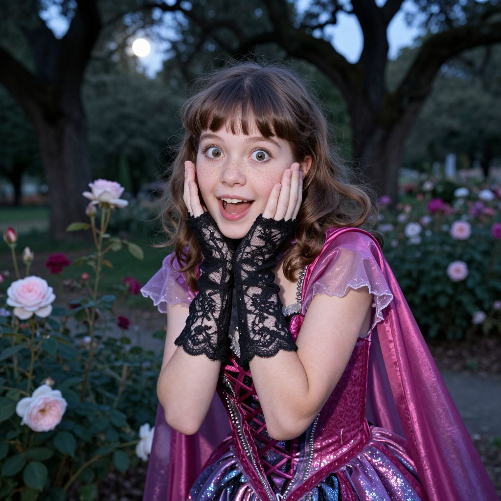 A playful teenage girl with fair skin, wide expressive eyes, and freckles, sporting a lace closure bangs hairstyle that adds a subtle romantic touch, dressed in a glittery pink and purple goth-costume with lace gloves and a flowing cape; photographed in a moonlit garden with blooming roses and old oak trees in the background.