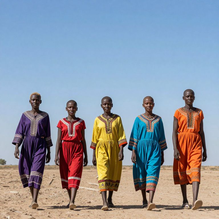 Photograph of five African women standing in a row on a dry, sandy terrain under a bright blue sky. Each woman wears a traditional, colorful dress with intricate embroidery: from left to right, purple, red, yellow, blue, and orange. The dresses are loose-fitting with long sleeves and reach just below the knees. The women have dark skin and are barefoot. They stand with a neutral expression, facing the camera. The background is a clear, cloudless sky, emphasizing the vivid colors of their attire. The sandy ground has sparse vegetation.