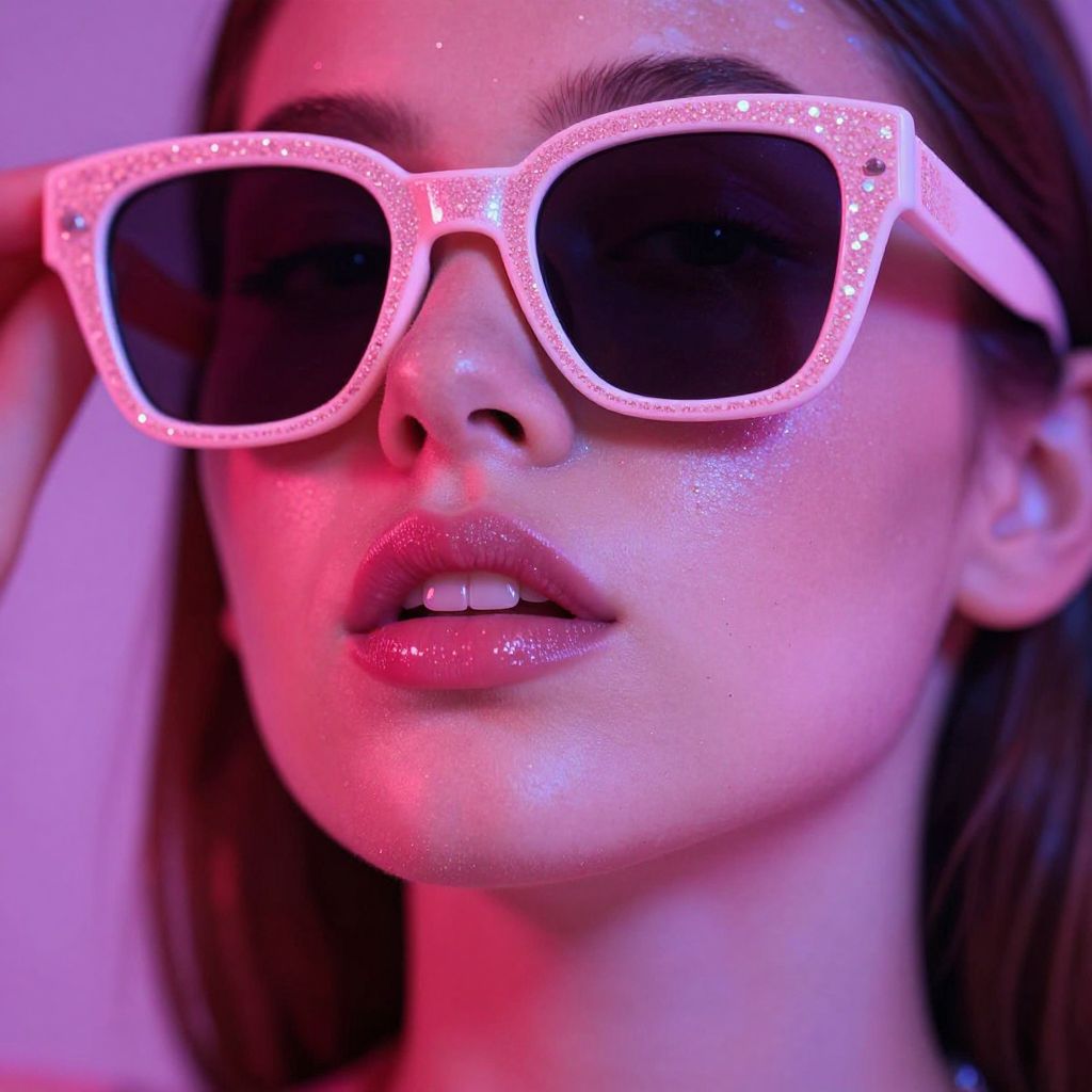 Photograph of a woman with pink glitter sunglasses, pink and purple lighting, glossy pink lips, and dark brown hair, looking cool and confident.