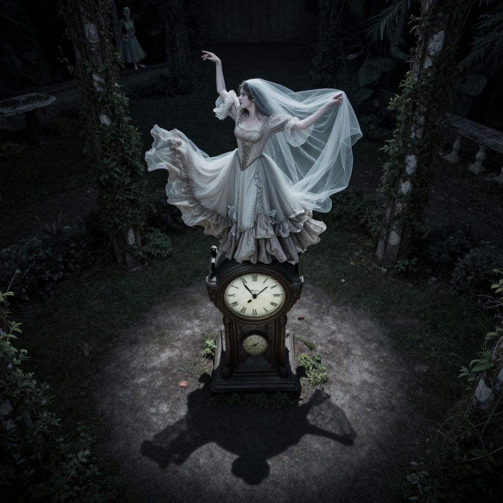 In the surrealistic vein of an iconic dreamlike scene, depict a ghostly female figure in a tattered Victorian-era gown dancing atop a distorted timepiece in a moonlit garden setting. The ethereal woman's flowing veil billows in an eerie breeze as her shadow mimics her movements on the ground beneath, creating a captivating interplay of light and darkness. This aerial perspective emphasizes the surreal atmosphere while evoking a sense of melancholic longing for a bygone era, masterfully blending horror, romance, and fantasy to leave a lasting impression on the viewer's imagination.