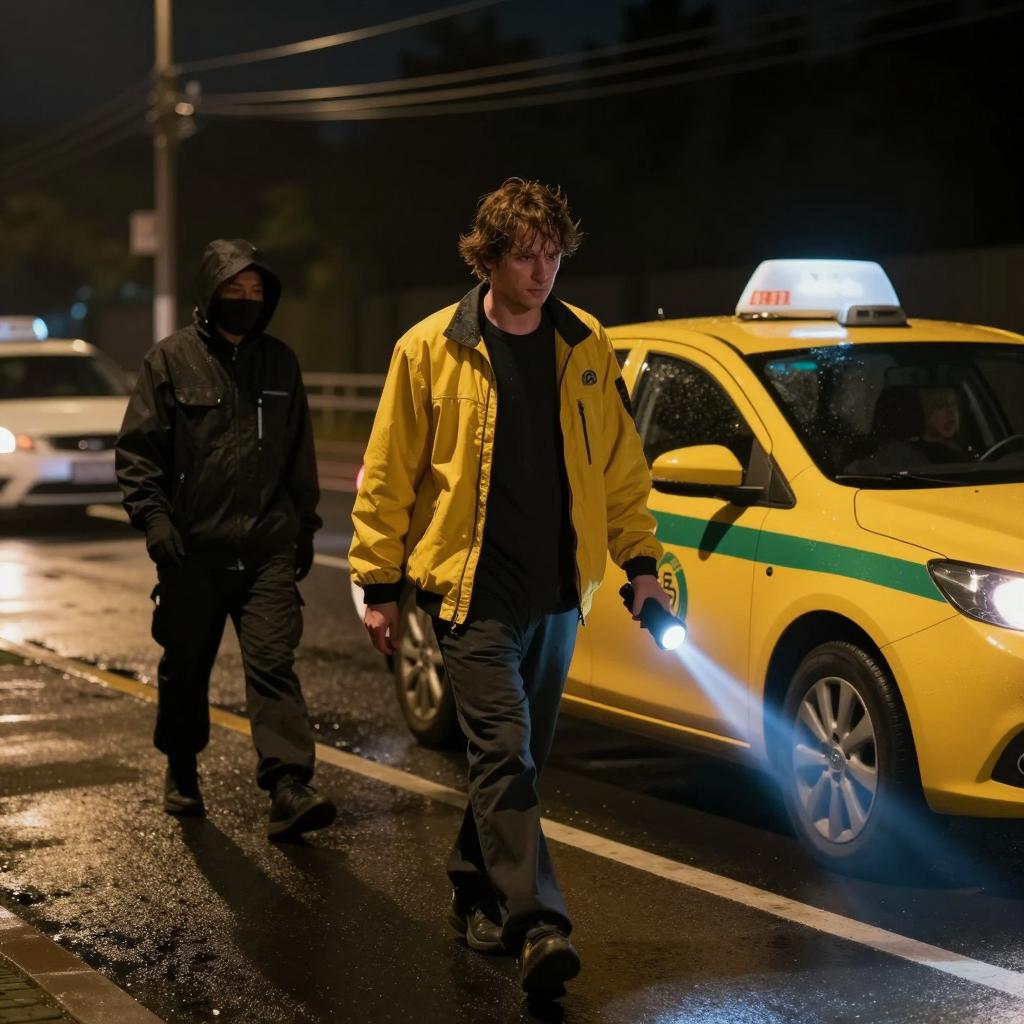 Four men in front of a parked car. One man kneels on wet ground, head down, near the car's front door. Two men stand, one with a gun, both wearing hats and jackets. Fourth man in the background, leaning against car. Car has a flashing light on the roof. Wet ground, concrete wall in background. Kneeling man's face partially obscured.