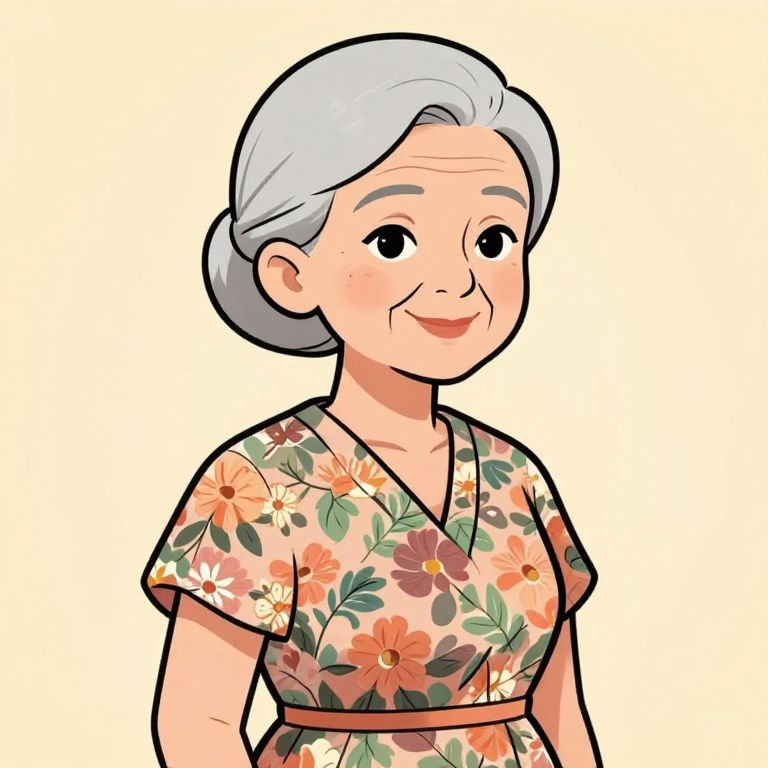 Grandma webtoon character design, modern elder with a stylish twist, floral dress, silver hair tied back, inviting warm background, clean comic linework, whimsical vibe