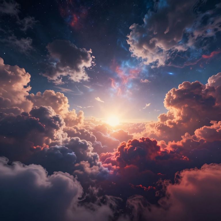 A mesmerizing digital artwork captures a celestial scene where vibrant clouds converge toward a radiant light source, evoking a cosmic symphony of colors and emotions, rendered with dramatic lighting and high-definition detail.